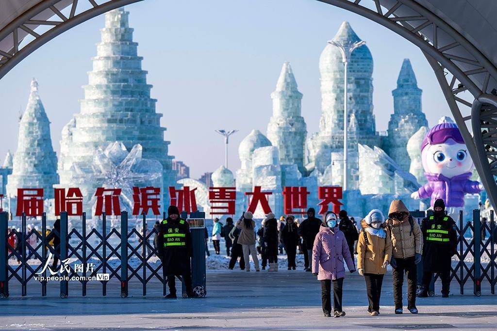 2026年1月23日,黑龙江哈尔滨,旅客在第二十七届哈尔滨冰雪大寰球游玩。