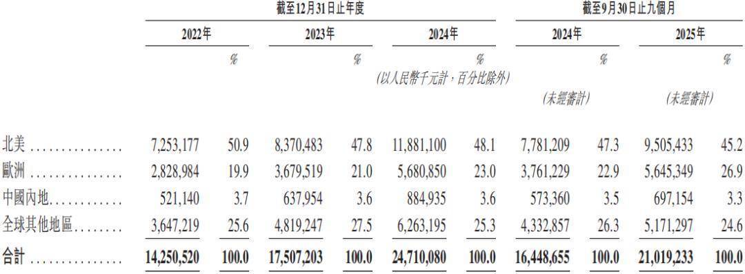 绿联最平直、也最具参照意旨的敌手,是同为跨境滥用电子龙头的安克鼎新。2022—2024年,安克鼎新营收分手为142.51亿元、175.07亿元和247.10亿元,年复合增长率达 31.7%。2025 年前三季度,其境外收入占比高达96.7%,其中北好意思市集孝敬进步四成。