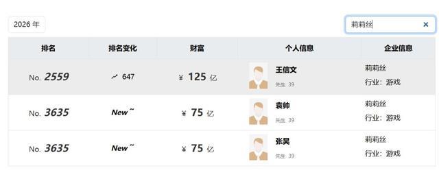 在最新揭晓的《2026胡润各人富豪榜》中,莉莉丝游戏的三位首创东说念主——王信文、张昊、袁帅,都都置身亿万富豪俱乐部,三东说念主资产总数高达275亿元。